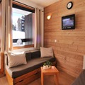 Designed for up to four guests, the studio features a versatile living space with two single beds and a sleeping alcove with bunk beds, making it an ideal choice for families or small groups. The separate kitchen is fully equipped with a microwave/grill, dishwasher, refrigerator, and ceramic hobs, ensuring you have everything you need to prepare hearty meals after a day on the slopes. The bathroom includes a bathtub for a relaxing soak, while the separate toilet adds extra convenience. Modern touches like a flat-screen TV and the option of paid resort Wi-Fi ensure a comfortable stay.