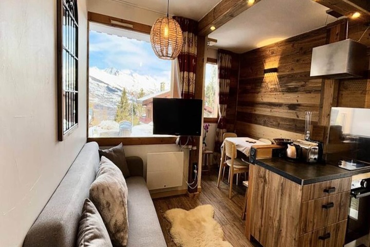 In the serene embrace of the French Alps, this charming 33 m² apartment offers a cozy retreat for up to four guests. Positioned on the second floor of the Le 4ème Dé residence, it combines modern comfort with alpine charm, making it the perfect base for your mountain adventures. The apartment features two bedrooms—one with a double bed and another with a double bunk bed—alongside a welcoming living room equipped with a TV and Wi-Fi. The kitchen is fully outfitted with an oven, dishwasher, microwave, induction hobs, refrigerator/freezer, and even a raclette and fondue set for authentic French dining experiences. A private balcony terrace faces north, offering tranquil mountain views, while a ski locker ensures convenience for winter sports enthusiasts. Additional amenities include a washing machine, separate toilet, and duvets for a warm and comfortable stay. Please note, this is a non-smoking, pet-free apartment.