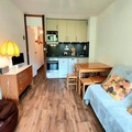 Step inside to discover a bright and welcoming living space, complete with a double sofa bed and a cozy atmosphere perfect for relaxing evenings. The newly renovated kitchen is fully equipped with modern appliances, including a ceramic hob, oven, microwave, and even a raclette grill for an authentic mountain dining experience. The bedroom features comfortable bunk beds and ample storage, while the updated bathroom offers a bathtub for a soothing soak after a day on the slopes. Additional conveniences like a ski locker and free parking right outside the residence make your stay hassle-free.