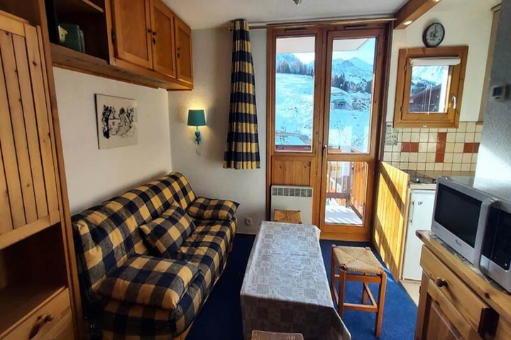 At an impressive altitude of 2,050 meters, this cozy studio in the Hameaux 1 Residence offers a front-row seat to the breathtaking alpine landscapes of Plagne Villages. Perfectly situated in the heart of the resort, this southwest-facing retreat invites you to embrace the magic of the mountains with slopes, ski school, and essential shops just steps away. Whether you're here for a family getaway or a romantic escape, the serene atmosphere and unparalleled ski-in/ski-out access make this property a true gem.