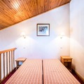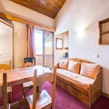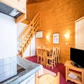 The apartment, designed for up to four guests, features a warm and functional layout. The living room includes a pull-out sofa bed for two, a flat-screen television, and an open-plan kitchen equipped with modern appliances such as a microwave, ceramic hob, refrigerator, dishwasher, and coffee maker. The mezzanine bedroom, accessible via a staircase, offers two single beds and ample storage space, creating a cozy and private sleeping area. A bathroom with a bathtub and a separate toilet ensure convenience, while additional amenities like a ski locker make this property ideal for ski enthusiasts.