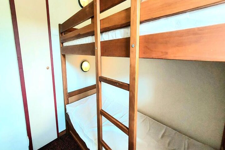 Inside, the 43m² apartment comfortably accommodates up to seven guests, making it ideal for families or groups of friends. The living room features two single beds and an additional trundle bed, while the two bedrooms provide restful options with a double bed in one and a bunk bed in the other. The kitchen is fully equipped with modern appliances, including a dishwasher, combi oven, ceramic hob, and refrigerator, ensuring you can prepare hearty meals after a day on the slopes. Two bathrooms, including one with a shower and toilet, add to the convenience, while a ski locker keeps your gear secure and organized.