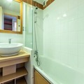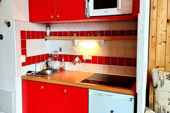 Inside, the 32m² apartment has been thoughtfully renovated to maximize comfort and functionality. The bright living room features a cozy sofa with a trundle bed, perfect for relaxing after a day on the slopes. The open-plan kitchen is fully equipped with modern appliances, including a refrigerator, dishwasher, ceramic hob, and microwave, making it easy to prepare hearty meals. The bedroom, complete with a bunk bed and a single bed, is ideal for families with children. Additional amenities include a ski locker, a covered parking space, and access to the Plagne Lauzes wellness area with a heated outdoor pool (subject to availability).