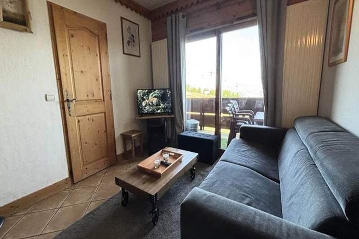 High above the scenic Tarentaise Valley, this charming 40m² apartment offers a serene mountain retreat with direct access to the slopes of Plagne Aime 2000. Located on the 8th floor of the prestigious Les Hauts Bois residence, it combines modern comfort with breathtaking alpine views, making it an ideal choice for families or groups of up to six. Whether you're here to carve through pristine snow or relax amidst stunning landscapes, this property promises an unforgettable stay in the heart of the French Alps. \n\nStep into the bright and inviting living room, where a cozy electric fireplace and a comfortable sofa bed create a warm ambiance. The space opens onto a long east-facing balcony, perfect for soaking in the morning sun and admiring the majestic peaks. The fully equipped kitchen, complete with a dishwasher, ceramic hobs, and a raclette grill, invites you to prepare hearty meals after a day on the slopes. The master bedroom features two single beds that can be joined to form a double, along with an en-suite shower. A second bedroom with twin beds and an additional bathroom with a bathtub ensure ample space and privacy for all guests.\n\nGuests of Les Hauts Bois enjoy exclusive access to a luxurious wellness area, including a swimming pool, sauna, and hammam, perfect for unwinding after an active day. The residence also offers a ski locker and covered parking for added convenience. Just 200 meters away, the vibrant shopping mall at Le Paquebot provides restaurants, shops, and essential services. For further exploration, the cable car connects you to Plagne Centre in minutes, opening up even more opportunities for adventure and leisure.\n\nWhether you're seeking thrilling ski runs, tranquil mountain vistas, or a relaxing spa experience, this apartment in Plagne Aime 2000 delivers it all. Embrace the magic of the Alps and create lasting memories in this exceptional alpine getaway.