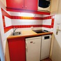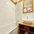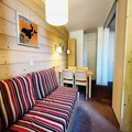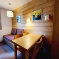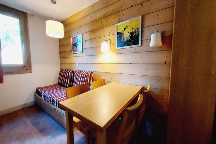 Inside, the apartment is thoughtfully designed for comfort and functionality. The living room, cleverly divided by a sliding partition, features a convertible sofa bed and a trundle bed, accommodating up to four guests. A fully equipped kitchen with modern appliances, including a microwave, refrigerator, dishwasher, and ceramic hob, ensures you have everything needed to prepare hearty meals. The bathroom includes a bathtub for a soothing soak, while a separate toilet adds convenience. Additional amenities such as a ski locker and access to a heated outdoor swimming pool (seasonal) enhance your stay.