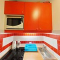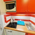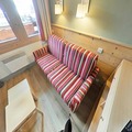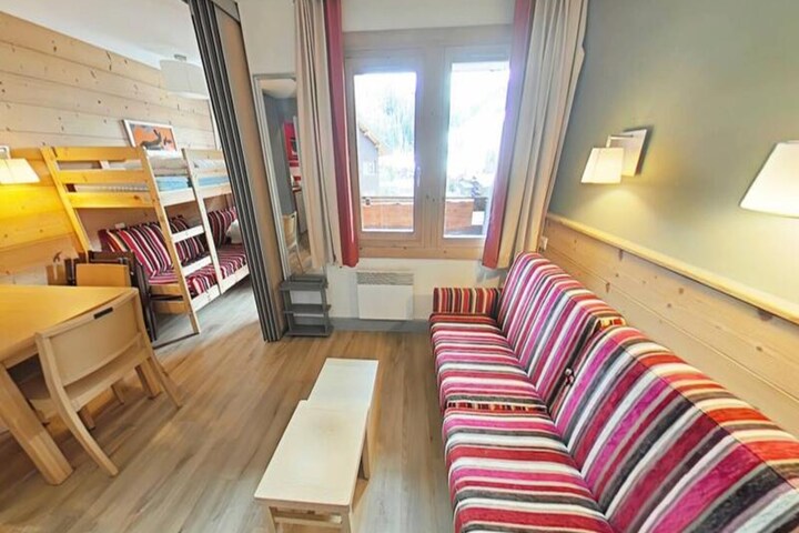 Step inside to discover a bright and inviting living space cleverly divided by a sliding partition. The seating area features a comfortable sofa bed and television, while the sleeping nook is equipped with a bunk bed, making it ideal for up to four guests. The fully equipped kitchen includes everything you need for home-cooked meals, from a microwave to a coffee maker, while the bathroom offers a relaxing bathtub to unwind after a day on the slopes. Separate restrooms and included Wi-Fi add to the convenience. A ski locker at the entrance and a nearby covered parking space ensure hassle-free logistics for your stay.