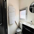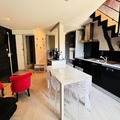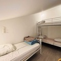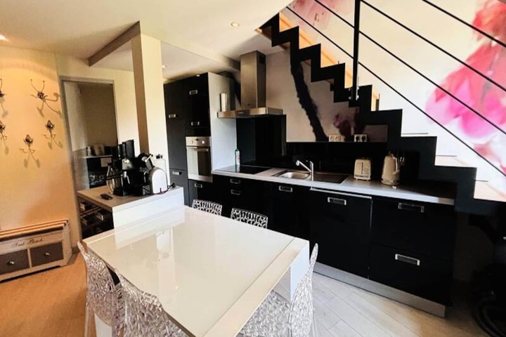 The apartment spans two levels, thoughtfully designed for comfort and convenience. Upstairs, you'll find a mezzanine with a sofa bed and TV, as well as a bedroom featuring a single bed and a bunk bed. A modern shower room with a toilet completes the upper floor. Downstairs, a cozy double bedroom awaits, alongside a bright living room perfect for unwinding after a day of adventure. The fully equipped open-plan kitchen includes everything from an oven and induction hobs to a dishwasher and coffee maker, making it easy to prepare hearty meals. A second shower room with a washing machine and a separate toilet add to the practicality. Step out onto the west-facing balcony to soak in the alpine views and fresh mountain air.