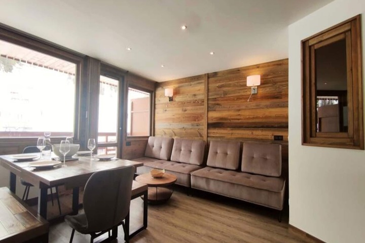 Spanning 60m², this high-end apartment comfortably accommodates up to six guests. The thoughtfully designed layout includes two cozy bedrooms and two modern bathrooms. The master bedroom features a plush double bed and an en-suite bathroom, while the second bedroom, overlooking the living area, offers four bunk beds, perfect for families or groups of friends. The open-plan kitchen is fully equipped with ceramic hobs, an oven, a microwave, a refrigerator, and a dishwasher, making it easy to prepare hearty meals after a day on the slopes. The living room, with its comfortable sofa bed and flat-screen TV, provides the perfect space to unwind. Additional conveniences include a wall-mounted ski boot dryer, Wi-Fi, and a washing machine with a tumble dryer.