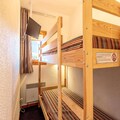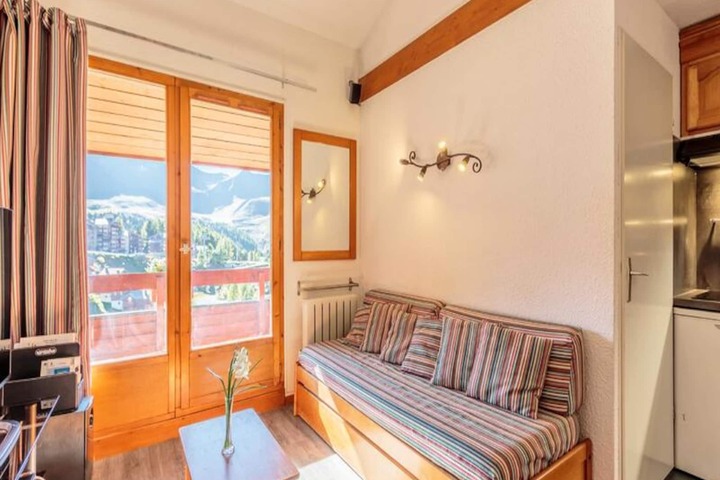 Designed with comfort and practicality in mind, the 39m² apartment accommodates up to six guests. The bright living room features a pull-out bed and a home cinema system, perfect for cozy evenings after a day on the slopes. The well-equipped kitchen includes a dishwasher, ceramic hobs, and a multi-function oven, making meal preparation a breeze. Upstairs, you'll find a serene double bedroom, a mezzanine with a single bed, and a second bedroom with bunk beds, ensuring ample space for families or groups. Modern conveniences like Wi-Fi, satellite TVs, and a ski locker enhance your stay, while the option to bring your pet adds a touch of home.
