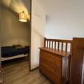 The apartment spans 39m² and comfortably accommodates up to six guests. Its bright living room features a cozy double sofa bed and a television, perfect for unwinding after a day on the slopes. The well-equipped kitchen includes a dishwasher, microwave, ceramic hob, and refrigerator, making meal preparation a breeze. The sleeping arrangements are thoughtfully designed, with a single bed in the first bedroom, a double and single bed in the upstairs second bedroom, and an additional single bed on the mezzanine. A bathroom with a bathtub and a separate toilet add to the convenience. Modern amenities such as WiFi, a ski locker, and a travel cot ensure a comfortable and hassle-free stay.