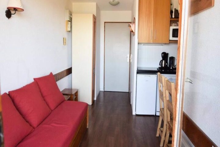 This cozy 31m² apartment is thoughtfully designed to accommodate up to five guests. The living room features a dining area and two pull-out beds, while the bedroom offers two comfortable single beds. A sleeping alcove with an additional single bed provides extra flexibility. The well-equipped kitchen includes ceramic hobs, a refrigerator, microwave, and dishwasher, making it easy to prepare meals after a day on the slopes. Modern amenities such as WiFi, a flat-screen TV, and a private ski locker enhance your stay, while the north-facing balcony offers stunning views of the resort and valley below.