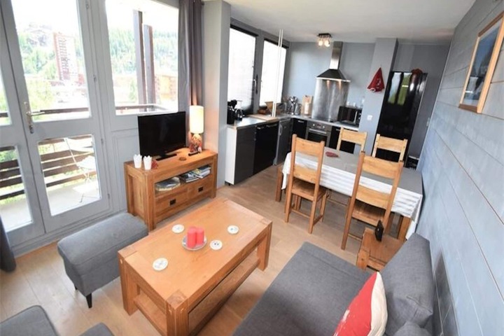 High above the breathtaking Tarentaise Valley, this beautifully renovated apartment offers a serene alpine retreat with panoramic views of Mont Blanc and the surrounding peaks. The residence is perfectly situated just 200 meters from the slopes, allowing you to ski back to the building after a day on the pristine runs of La Plagne. Whether you’re seeking adventure or relaxation, this property promises an unforgettable stay in the heart of the French Alps. \n\nStep inside this spacious 61 m² apartment, thoughtfully designed to accommodate up to seven guests. The bright living area features a comfortable sofa bed, a dining space, and a fully equipped American-style kitchen with modern appliances including a ceramic hob, dishwasher, oven, microwave, and two refrigerators. The sleeping arrangements include a cozy double bedroom and a second bedroom with two sets of bunk beds, making it ideal for families or groups of friends. Two sleek shower rooms, a separate WC, and convenient amenities like a washing machine and Wi-Fi ensure your stay is as comfortable as it is stylish. The large balcony invites you to unwind with a glass of wine while soaking in the majestic views of Mont Blanc and the valley below. \n\nThe residence is just a short walk from local shops and a vibrant shopping arcade, offering easy access to everything you need during your stay. Outdoor parking is available nearby, and the property includes two ski lockers for your convenience. Beyond skiing, the area transforms into a summer paradise with hiking trails, mountain biking routes, and stunning vistas that will captivate nature lovers and adventure seekers alike. \n\nWhether you’re chasing powder or exploring alpine meadows, this apartment is your gateway to the wonders of La Plagne. Book your stay now and create lasting memories in one of France’s most iconic mountain destinations.