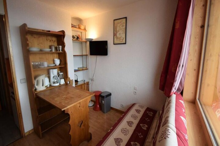 High above the Tarentaise Valley, where snow-dusted peaks meet serene alpine charm, this cozy studio in the LE PLEIN SUD residence offers a tranquil retreat for couples seeking a mountain getaway. With direct access to the slopes, you can step out and embrace the thrill of skiing without delay. The residence’s quiet ambiance and proximity to nature make it a perfect choice for those looking to unwind amidst breathtaking scenery. From your north-facing balcony, soak in the crisp mountain air and enjoy uninterrupted views of the majestic alpine landscape. \n\nThe studio, thoughtfully designed for two guests, features a comfortable double sofa bed, a compact yet functional kitchenette equipped with electric hobs, a microwave, and a refrigerator, as well as a private bathroom with a shower and WC. The ski locker on the ground floor ensures your gear is always ready for the next adventure. Modern conveniences like WiFi and vinyl flooring add to the comfort of your stay, while the residence’s free outdoor parking and shuttle service to the village center make exploring the area effortless. \n\nLocated just 700 meters from shops and a sports store, you’ll find everything you need within easy reach. The free shuttle service runs every 15 minutes, connecting you to the vibrant village center where you can discover local restaurants, après-ski activities, and charming boutiques. Whether you’re here for the exhilarating slopes or the peaceful summer trails, the surrounding area offers endless opportunities for outdoor adventures. \n\nChoose LE PLEIN SUD for its unbeatable location at the foot of the slopes, its quiet and welcoming atmosphere, and the promise of unforgettable alpine memories. Whether it’s the thrill of skiing or the tranquility of the mountains, this studio is your gateway to the best of Plagne Villages.