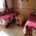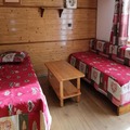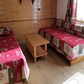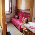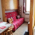 This cozy studio apartment offers a warm and inviting atmosphere with paneled walls and modern furnishings. It features a divisible living space with two sofa beds, a double convertible sofa, and a television. The apartment is non-smoking and allows pets with a supplement of €40. It also includes a south-facing balcony with an open view, providing a peaceful spot to unwind. The apartment is located on the ground floor and comes with ski lockers for added convenience.