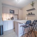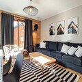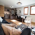 The kitchen is fully equipped with modern appliances, including a dishwasher, oven, microwave, and coffee maker. The living area leads to a west-facing terrace with stunning views of the Aigueblanche valley. Additional amenities include a ski locker with a boot dryer, a washing machine and dryer, two bathrooms, and baby equipment like a crib and high chair, making it perfect for families.
