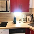 The apartment includes an independent kitchen with a microwave, dishwasher, fridge, electric coffee maker, Nespresso machine, toaster, kettle, and blender, providing all the essentials for a self-catering stay. The bathroom is equipped with a bathtub, and there is a separate toilet for added convenience. A vacuum cleaner and heating ensure a comfortable and well-maintained environment throughout your stay.