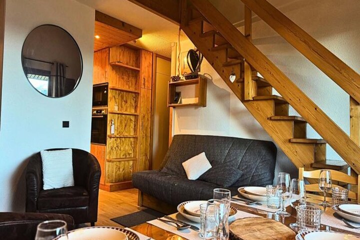 This spacious duplex accommodates up to 8 guests, offering a comfortable stay with 4 rooms and a mezzanine. The first level features a bedroom with 2 bunk beds, a single bed, and a bright living room with a sofa, two armchairs, and a dining area. Upstairs, a mezzanine has a single bed, with two additional bedrooms: one with a double bed (160 cm) and the other, ideal for children, with two single beds. Duvets are provided for all beds, and the apartment includes a TV, baby travel cot, high chair, and board games.