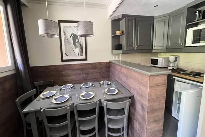This charming 2-room plus cabin apartment comfortably accommodates up to 6 people. The living room features a bench seat with a pull-out bed, while the bedroom is furnished with a double bed. The cabin bedroom offers bunk beds, and all beds are equipped with duvets for comfort. The apartment is non-smoking and does not allow pets. Linen and cleaning services are available for an additional fee, and the tourist tax is not included in the rental price. The apartment is easily accessible via elevator from the Teppes P1 covered car park.