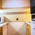 The apartment is equipped with a fully functional kitchenette, including a Fagor refrigerator, Whirlpool dishwasher, microwave, and Brandt oven and 3-burner hob. Additional amenities include a coffee maker, kettle, toaster, and a blender for easy meal preparation. The bathroom is separate from the toilet, and the apartment is also equipped with an iron, a vacuum cleaner, and heating to ensure a comfortable stay year-round.