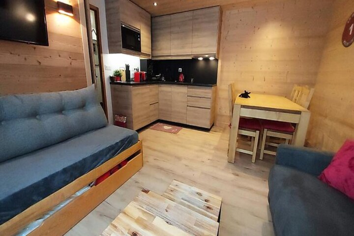 High above the charming hamlet of Crève Coeur, this cozy apartment invites you to experience the magic of the French Alps. Imagine waking up to the crisp mountain air, stepping onto your southwest-facing terrace, and taking in the serene views of the surrounding residences. With ski slopes just 0 meters away and ski lifts a mere 80 meters from your door, this is a skier’s paradise, offering unparalleled convenience for your alpine adventures. Whether you’re here to carve through fresh powder or explore the scenic trails, every moment feels like a celebration of nature’s beauty. \n\nInside, the apartment is thoughtfully designed with comfort and practicality in mind. The fully renovated open-plan kitchen is equipped with modern amenities including a dishwasher, induction hob, microwave, and refrigerator, making meal preparation a breeze. The living room features a double sofa bed and a TV, perfect for unwinding after a day of exploration. The separate bedroom offers two single beds, ensuring restful nights for all guests. A separate bathroom and toilet add to the convenience, while the ski lockers in the residence keep your gear secure and ready for action. Please note that Wi-Fi is not included, and the apartment is non-smoking and pet-free, ensuring a clean and tranquil environment. \n\nThe residence \