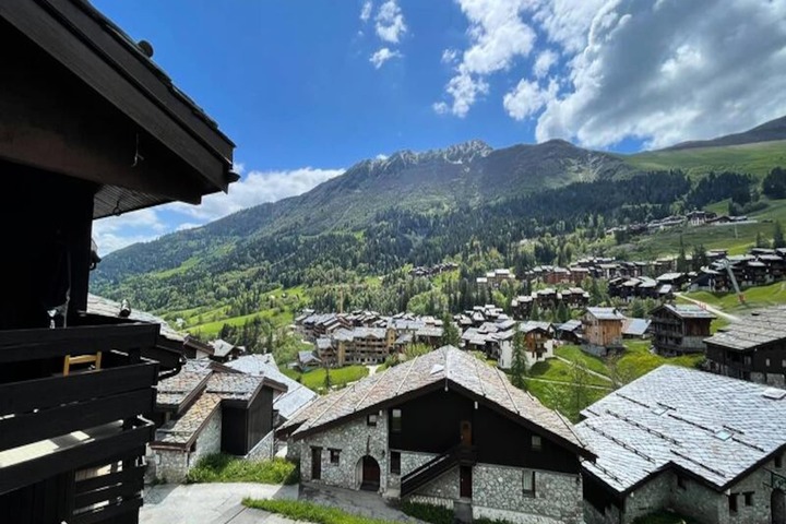 High above the charming Valmorel resort, this cozy studio apartment offers a serene alpine escape with breathtaking views of the surrounding mountains and village below. Imagine sipping your morning coffee on the southeast-facing balcony as the sun rises over the peaks, preparing for a day of adventure in the snow or on scenic trails. This tranquil retreat is perfect for couples or small families seeking comfort and convenience in the heart of the French Alps. \n\nThe apartment spans 27 square meters and is thoughtfully designed to maximize space and functionality. The entrance hall features a well-equipped kitchen with modern appliances including a stovetop, dishwasher, microwave, and refrigerator, making it easy to prepare hearty meals after a day outdoors. The dining area comfortably seats four, while the living room offers flexible sleeping arrangements with a trundle bed and two single sofa beds. A movable partition ensures privacy, and the bathroom with a separate toilet adds practicality to your stay. While Wi-Fi is not included, the panoramic views and cozy atmosphere provide the perfect setting to disconnect and unwind. \n\nLocated in the peaceful La Forêt neighborhood, the residence is just 100 meters from the slopes and ski lifts, ensuring effortless access to Valmorel’s renowned skiing terrain. A short 10-minute walk via a pedestrian path leads to the resort center, where you’ll find shops, restaurants, and a kindergarten for young children. Whether you’re exploring the slopes in winter or hiking the trails in summer, this apartment serves as an ideal base for your alpine adventures. \n\nWith its blend of comfort, convenience, and stunning scenery, this studio invites you to experience the magic of the French Alps in every season.