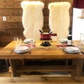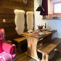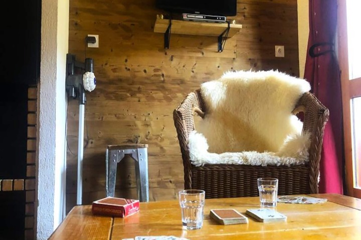 The apartment comfortably accommodates 4 to 6 guests, featuring a bright open-plan kitchen and living area complete with a crackling fireplace to unwind after a day on the slopes. The bedroom is equipped with two double bunk beds, while the living room offers a sofa bed for additional sleeping space. A fully equipped kitchen includes everything from a microwave and oven to raclette and fondue sets, ensuring cozy evenings filled with delicious meals. Modern conveniences like a TV, DVD player, and high-speed WiFi make your stay even more enjoyable.
