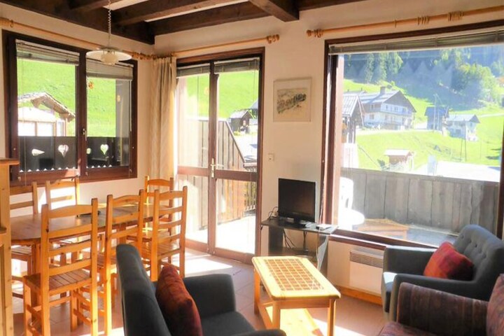In the heart of the picturesque Beaufortain region, this charming apartment in Arêches-Beaufort offers an idyllic alpine retreat for both summer and winter escapes. With its south-facing terrace basking in sunlight and a location directly at the foot of the slopes, this cozy haven invites you to immerse yourself in the beauty of the French Alps. Whether you’re drawn to the thrill of skiing or the tranquility of mountain hikes, this property places you at the center of it all. \n\nThe apartment, designed to accommodate up to six guests, boasts a bright and inviting living space with an open-plan kitchen fully equipped for your convenience, including a dishwasher and a small washing machine. The sleeping arrangements are thoughtfully laid out with one bedroom featuring three single beds (two of which are bunk beds), another with a comfortable double bed, and a living room with a double sofa bed. A modern bathroom, separate toilet, and a ski locker add to the practicality of this delightful rental. The large 24 m² terrace is the perfect spot to relax after a day of adventure, offering stunning views of the surrounding peaks.\n\nLocated within walking distance of the charming village of Arêches, you’ll find everything you need nearby, from local shops and restaurants to ski schools and hiking trails. In winter, enjoy direct access to the slopes, while summer transforms the area into a paradise for walkers, with serene lakes and lush alpine meadows waiting to be explored. The region’s rich heritage and breathtaking landscapes make it a destination worth discovering year-round.\n\nWhether you’re planning a family getaway or a trip with friends, this apartment offers the perfect blend of comfort, convenience, and natural beauty. Create unforgettable memories in the heart of Savoie Mont-Blanc, where every season brings its own unique charm.