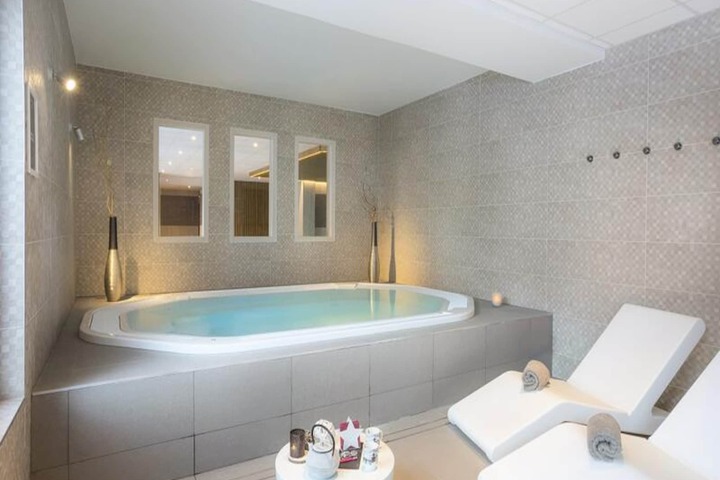 Designed with families and groups in mind, the apartments feature tasteful decor and practical layouts. Each unit includes a spacious living area with a sofa bed, a fully equipped kitchen, and two bedrooms with adaptable single beds. Modern conveniences such as free Wi-Fi, a baby kit on request, and access to an indoor heated pool ensure a seamless and enjoyable stay. The wellness facilities are a highlight, boasting a jacuzzi, hammam, sauna, and a Zen Studio offering yoga, aquarelaxation, and more.