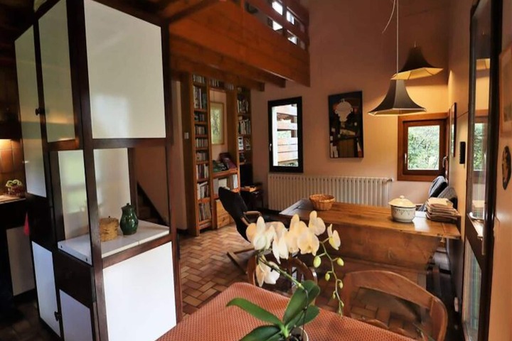 Step inside to discover a warm and inviting living area that seamlessly combines a lounge, dining space, and a fully equipped kitchen. The first half-level features a charming attic bedroom with exposed beams, a double bed, and two bunk beds, complete with a balcony overlooking the verdant garden. A modern bathroom with a shower and heated towel rail ensures your comfort. Ascend another half-level to find a cozy double bedroom and a library/office nook, perfect for quiet moments or remote work. For skiers, the converted garage with a ski room and direct access to the living area adds convenience to your alpine adventures.