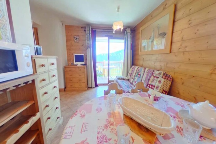 Amid the serene beauty of the French Alps, this elegant residence offers a tranquil escape just 5.6 km from the heart of Les Saisies. With its south/east-facing balcony, the apartment invites you to bask in the morning sun while savoring breathtaking alpine views. Whether you're seeking a winter wonderland or a summer retreat, the heated indoor swimming pool (available during peak seasons) adds a touch of luxury to your stay, providing relaxation after a day of adventure in the mountains. The residence combines modern comfort with alpine charm, creating a perfect haven for couples or small families. \n\nInside, the apartment is thoughtfully designed to ensure a cozy and convenient experience. The living room features a comfortable double sofa bed, while the bedroom offers a peaceful retreat with its double bed and courtyard-facing window. The open-plan kitchen seamlessly connects to the living area, making it easy to prepare meals and share moments together. A stylish shower room and separate toilet complete the layout, ensuring privacy and practicality. Guests also benefit from a covered parking space, adding convenience to their alpine getaway. \n\nLes Saisies is renowned for its outdoor activities, from skiing and snowboarding in winter to hiking and cycling in summer. The nearby village offers charming restaurants, shops, and cultural events, allowing you to immerse yourself in the local alpine lifestyle. For nature enthusiasts, the surrounding trails and panoramic vistas provide endless opportunities to explore and reconnect with the great outdoors. \n\nWhether you're here to embrace the thrill of the slopes or simply unwind amidst stunning scenery, this residence offers an unforgettable alpine experience. Let the beauty of the French Alps inspire your next adventure and create cherished memories in this idyllic retreat.