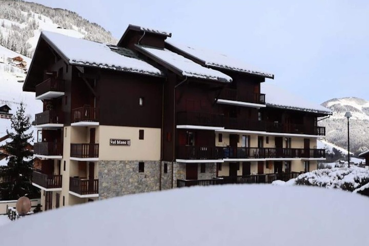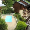 The 25m² apartment, located on the raised ground floor of the Val Blanc II residence, is thoughtfully designed for a comfortable stay. The cabin-style entrance features bunk beds, while the living room includes trundle beds and a fully equipped kitchenette with a dishwasher. An alcove with a double bed and a mezzanine provide additional sleeping arrangements. The west-facing balcony is perfect for soaking in the serene mountain views after a day of exploration. Guests can also enjoy the shared swimming pool during the summer months, adding a refreshing touch to their alpine getaway.