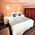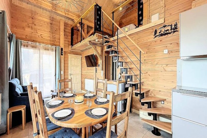 Spanning 75 m², this newly built chalet (2024) comfortably accommodates up to six guests. The bright and spacious living area is ideal for cozy evenings, featuring a dining table for six, a plush sofa, and a TV. The open-plan kitchen is fully equipped with modern appliances, including a ceramic hob, oven, microwave, dishwasher, and even raclette and fondue sets for authentic French dining experiences. The chalet boasts two bedrooms—one with a double bed and space for a baby cot, and another with two single beds—plus a mezzanine with two additional single beds that can be joined to form a double. A shower room with a hairdryer and a children’s corner on the mezzanine ensure comfort for all ages.