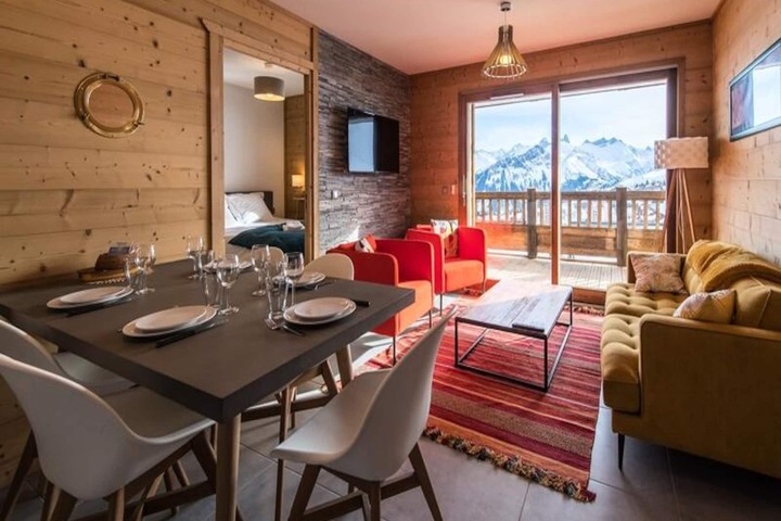 The apartment features a living room opening onto a balcony and a sublime view of the Aiguilles d'Arves. The living room offers a lounge/dining area and a fully equipped kitchen. A first bedroom with its own bathroom is equipped with a queen-size bed. The second bedroom also offers a queen-size bed and a TV. It shares a bathroom with the sleeping area and its bunk bed (the top bunk is not suitable for children under 6 years old). Finally, a separate toilet completes this property. End-of-stay cleaning is included, as are bed linen and bathroom linen rentals.