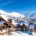 At the foot of the majestic peaks of Les Sybelles, this charming residence invites you to immerse yourself in the serene beauty of the French Alps. Just 50 meters from the Milky Way chairlift, Goélia Les Alpages du Corbier*** offers a perfect blend of traditional mountain architecture and modern comforts, making it an ideal retreat for ski enthusiasts and nature lovers alike. Whether you're seeking thrilling adventures on the slopes or tranquil moments surrounded by alpine vistas, this property promises unforgettable experiences. \n\nThe residence comprises three cozy chalets, each thoughtfully designed to provide warmth and relaxation. Guests can enjoy the heated outdoor swimming pool, unwind in the sauna, or stay active in the small fitness area—all conveniently located on-site. Accommodations are equipped with a living room featuring a pull-out sofa bed, a fully equipped kitchen, and a comfortable bedroom with options for double beds or bunk beds. Additional amenities include WiFi access, television, and optional extras such as linen kits and baby equipment to ensure a hassle-free stay. \n\nSituated in the heart of Le Corbier, a family-friendly resort awarded the \