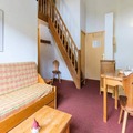 Spanning 40 m², this thoughtfully designed apartment comfortably accommodates up to eight guests. The main living area features a cozy sofa bed, a flat-screen TV, and direct access to a sunny balcony where you can soak in the stunning alpine scenery. The kitchenette is fully equipped with modern appliances, including a ceramic hob, microwave, refrigerator, dishwasher, and coffee maker, making it easy to prepare hearty meals after a day on the slopes. The layout includes a private bedroom with a double bed and wardrobe, a bathroom with a separate toilet, and an upstairs area with two bunk beds and an additional sleeping nook with two more bunk beds—ideal for families or groups of friends.