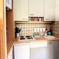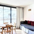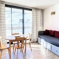 Inside, the apartment is bright and welcoming, featuring a cozy living area with a sofa bed, a flat-screen TV, and a dining table for five. The fully equipped kitchenette includes everything you need to prepare delicious meals, from a Nespresso® machine to a raclette grill for authentic alpine evenings. The alcove, separated by a curtain, provides additional sleeping arrangements with bunk beds and a pull-out bed, making this space ideal for families or small groups. A renovated shower room and ample storage complete the interior, while the residence offers convenient amenities such as a ski locker, two elevators, and parking just 50 meters away.