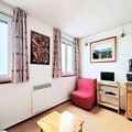 The studio is thoughtfully designed to maximize comfort and functionality within its 26m² space. It accommodates up to five guests with a clever layout that includes a living area featuring a comfortable sofa bed, a single sofa bed, and a cozy alcove with bunk beds separated by a curtain for added privacy. The open-plan kitchen is fully equipped with modern appliances such as a ceramic hob, dishwasher, oven, microwave, and toaster, making it easy to prepare hearty meals after a day on the slopes. A shower room with a washing machine adds convenience, while the dining area and television create a welcoming space to relax and unwind.