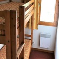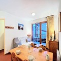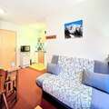 Inside, the apartment is thoughtfully designed to accommodate up to six guests in comfort. The bright living room features a cozy sofa bed, a large-screen TV, and direct access to the balcony, where you can unwind with panoramic views. The well-equipped kitchenette includes everything you need to prepare hearty meals, from a ceramic hob to a Nespresso® coffee machine and even a raclette grill for authentic alpine dining. Two inviting bedrooms – one with a double bed and another with bunk beds – provide restful spaces for families or groups of friends. A separate bathroom and toilet add to the convenience, while modern amenities like a ski locker and access to a heated swimming pool enhance your stay.