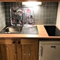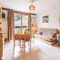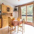 Inside, the 31m² space is thoughtfully designed for comfort and functionality. The living room, adorned with warm pine furnishings, includes a double sofa bed, a television, and a large bay window that frames stunning slope views. A separate alcove with bunk beds provides additional sleeping arrangements, making it ideal for families or small groups. The kitchenette is fully equipped with a ceramic hob, microwave, and oven, perfect for preparing hearty meals after a day on the slopes. Modern conveniences such as a washing machine and ample storage add to the ease of your stay.