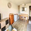 Inside, the 28m² studio is thoughtfully designed to accommodate up to four adults and one child, making it ideal for families or small groups. The sleeping alcove features bunk beds and a pull-out bed, while the living area includes a comfortable sofa bed, flat-screen TV, and a well-equipped kitchenette with a mini-oven, microwave, and raclette set for cozy evenings. The bathroom is fitted with a shower and washing machine, and a separate toilet adds extra convenience. Guests also enjoy free access to a heated swimming pool during their stay, perfect for unwinding after a day of adventure.