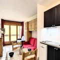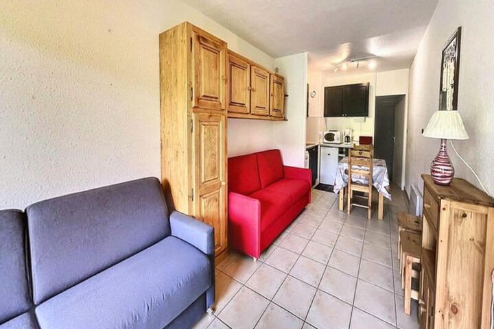 Inside, the studio is thoughtfully designed to accommodate up to four guests. The living area features two comfortable double sofa beds and a well-equipped kitchenette with modern appliances including a microwave, dishwasher, coffee maker, and raclette grill. A flat-screen TV and ample storage space complete the cozy interior, while the shower room provides practical comfort after a day on the slopes. Guests can also enjoy complimentary access to the heated swimming pool during their stay, adding a touch of luxury to the experience.