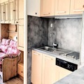 Inside, the 22m² studio is thoughtfully designed to maximize comfort and functionality. The living area features two double sofa beds, a flat-screen TV, and a dining table with stools, making it perfect for up to four guests. The well-equipped kitchenette includes a dishwasher, ceramic hob, microwave, Nespresso® coffee machine, and even a raclette grill and fondue set for cozy evenings in. Additional amenities such as a washing machine, hairdryer, and ample storage ensure a hassle-free stay. Guests also enjoy free access to a heated swimming pool during their one-week stay, adding an extra touch of relaxation to their mountain getaway.