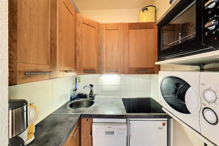 High above the serene slopes of the French Alps, this charming apartment in the Lunik Residence offers a perfect retreat for ski enthusiasts and nature lovers alike. Situated in the lower part of the resort, it boasts ski-in/ski-out access with the La Voie Lactée chairlift just steps away. Imagine waking up to the crisp mountain air, sipping coffee on your spacious balcony, and watching the first skiers carve their way down the slopes. This tranquil setting combines the best of alpine charm with modern convenience. \n\nThe apartment’s thoughtful layout ensures a comfortable stay for up to six guests. The bright living room features a cozy double sofa bed, a flat-screen TV, and a dining area for six, while the fully renovated kitchen is equipped with everything you need, from a ceramic hob to a dishwasher. The sleeping arrangements include a private bedroom with a double bed and dressing area, as well as a sleeping alcove with bunk beds, perfect for families. The bathroom and separate toilet add to the convenience, and the large balcony offers stunning views of the surrounding slopes, making it an ideal spot to unwind after a day of adventure. \n\nThe residence itself is rich in amenities, including six elevators, a ski locker, outdoor parking, and access to a heated swimming pool—free for guests over three years old during your stay. A mini-market and caterer are just steps away, and a free shuttle bus connects you to the upper part of the resort, the ESF ski school, and the snow front. Whether you’re hitting the slopes or exploring the charming alpine village, everything you need is within easy reach. \n\nThis apartment is more than just a place to stay; it’s a gateway to unforgettable alpine memories. From the thrill of skiing to the peaceful ambiance of the mountains, your perfect getaway awaits in the heart of the French Alps.