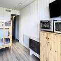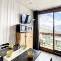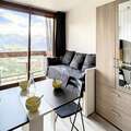 High above the shimmering Tarentaise Valley, this charming studio apartment offers a cozy retreat for alpine adventurers. Situated on the 19th floor of the Le Vanguard residence, guests are treated to breathtaking north-facing views of the surrounding mountains, creating the perfect backdrop for a memorable holiday. Whether you’re here for skiing, hiking, or simply relaxing, this residence places you at the heart of the action with ski-in/ski-out access and proximity to essential facilities. \n\nRecently renovated, the 22m² studio is thoughtfully designed to accommodate up to four guests. The entrance hall features a large closet for convenient storage, while the kitchenette is fully equipped with modern appliances including an induction hob, microwave, mini-oven, and more—ideal for preparing meals after a day on the slopes. The living room boasts a pull-out bed, bunk beds, a flat-screen TV, and a folding table, ensuring both comfort and functionality. Guests can enjoy free Wi-Fi throughout the building and access to a heated swimming pool, perfect for unwinding after outdoor adventures. \n\nFamilies will appreciate the nearby children’s daycare and playground, while the ESF ski school is just 200 meters away, making this location ideal for young skiers. A mini-market, caterer, and shopping arcade are within walking distance, ensuring you have everything you need at your fingertips. Pets are welcome under certain conditions, adding to the convenience of this alpine escape. \n\nWhether you’re seeking thrilling ski days or tranquil evenings soaking in the mountain views, this studio apartment is your gateway to the best of the French Alps. Book your stay and create unforgettable memories in this picturesque setting.