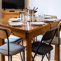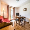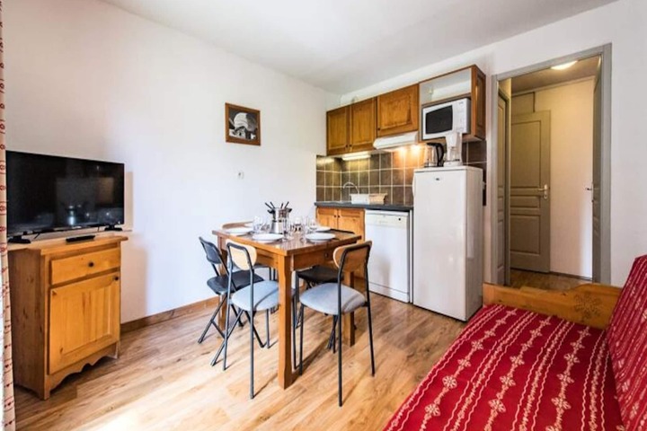 The apartment comfortably accommodates up to four guests, featuring a double bedroom and a mountain alcove with bunk beds. The living area exudes warmth with its inviting decor, television, and an open kitchen equipped with everything you need to prepare hearty Savoyard meals, including raclette and fondue sets. Step outside to a small private outdoor space, where a table and chairs await for you to soak in the crisp alpine air and stunning vistas. A dedicated ski locker ensures your equipment is always ready for the next adventure.