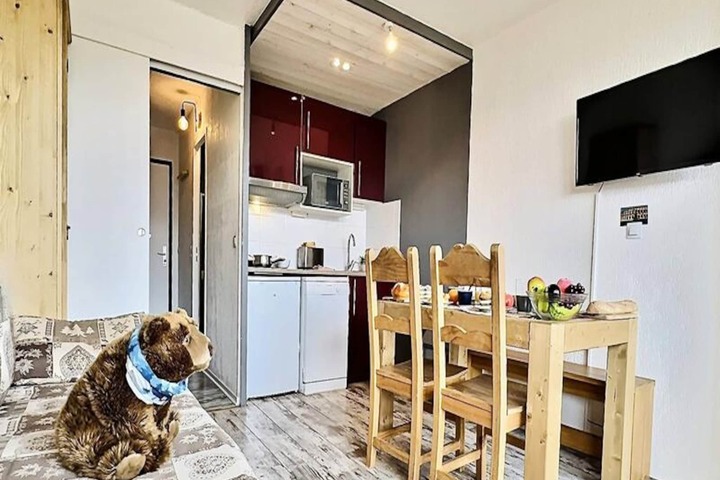 High above the shimmering waters of Tignes Lake, this charming studio invites you to experience the magic of the Alps in every season. Imagine waking up to breathtaking views of the mountains and forest from your northeast-facing balcony, where the crisp alpine air fills your senses. Whether you're here for thrilling winter sports or serene summer hikes, this residence offers the perfect base for your adventures, nestled in the vibrant Lavachet district just a short walk from the slopes and local shops. \n\nCompact yet thoughtfully designed, this 20m² studio accommodates up to four guests with a clever layout that maximizes comfort. The living room features a pull-out sofa bed that transforms into two singles or a double, while the entrance hall provides cozy bunk beds. A fully equipped kitchenette with electric hobs, a microwave, and a refrigerator makes meal preparation a breeze, and the modern bathroom ensures convenience after a day of activity. Additional amenities like a television, stereo system, and ski locker add to the ease of your stay.\n\nStep outside and discover the lively streets of Lavachet, where restaurants, cafes, and shops create a welcoming atmosphere. The ski lifts are just a 10-minute walk away, offering access to world-class slopes, while summer visitors can explore lush trails, sparkling lakes, and breathtaking vistas. Paid parking is available for your convenience, ensuring a hassle-free arrival.\n\nWhether you're seeking adrenaline-fueled days on the pistes or tranquil evenings by the lake, this studio combines comfort, location, and alpine charm to create unforgettable memories in the heart of Tignes.