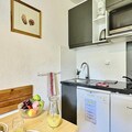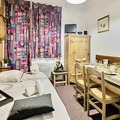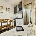 Designed for comfort and functionality, this 30m² apartment accommodates up to four guests. The living area features a plush sofa bed for two, while a cozy sleeping nook offers a set of bunk beds, perfect for families or small groups. The open-plan kitchenette is fully equipped with modern appliances, including an oven, microwave, dishwasher, and refrigerator, making it easy to prepare hearty meals after a day of alpine adventures. A bathroom with a bathtub and a separate toilet adds to the convenience, while a ski locker ensures your gear is always ready for the next outing.