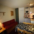The apartment itself is thoughtfully designed to accommodate up to six guests across its 40m² layout. The south-facing balcony invites you to soak up the sun and alpine air, while the renovated kitchen ensures a modern touch to your mountain escape. The living area features two single beds, a dining space, and a flat-screen TV for relaxed evenings. Two bedrooms provide restful retreats: one with a double bed and another with bunk beds, ideal for families or groups of friends. A well-equipped kitchenette with electric hobs, an oven, a refrigerator, and a dishwasher makes meal preparation a breeze. The bathroom includes a bathtub and sink, with a separate toilet for added convenience.