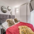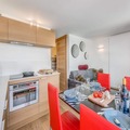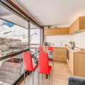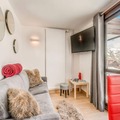 Completely renovated, the 26m² studio is thoughtfully designed to accommodate up to four guests. The living area features a cozy sofa bed, a flat-screen TV, and a large bay window that floods the space with natural light. The modern kitchen is equipped with ceramic hobs, a refrigerator, a combination microwave oven, a dishwasher, and even a washing machine, making it perfect for longer stays. A separate sleeping area with bunk beds ensures privacy and comfort, while the sleek bathroom with a bathtub and separate toilet adds a touch of luxury. Hotel services, including bed linen, towels, and end-of-stay cleaning, ensure a seamless and relaxing experience.