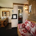 The studio, located on the 8th floor of this well-appointed residence, comfortably accommodates up to four guests. It features a practical layout with a mountain corner equipped with bunk beds, a living area with a trundle bed and TV, and a fully equipped kitchen with modern appliances including a microwave, dishwasher, and ceramic hobs. The bathroom is fitted with a bathtub and sink, while a separate toilet ensures added convenience. Thoughtful touches like duvets on all beds and a private ski locker enhance your stay, while additional services such as Wi-Fi and baby equipment can be arranged for a seamless experience.